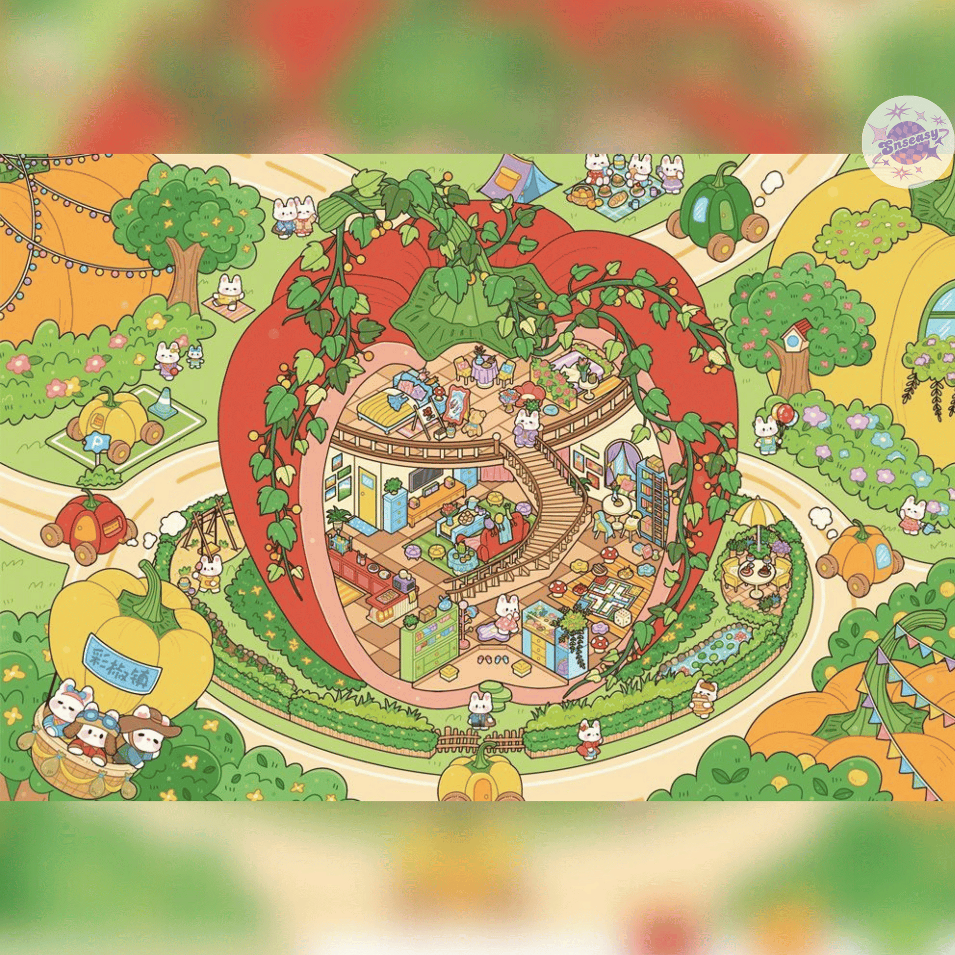 Cute Bunny Fruit Series – Plus Size 3D Sticker Scenes - 4 Theme Sets: Pepper Town | Carrot Terraces | Eggplant Swamp | Potato Island
