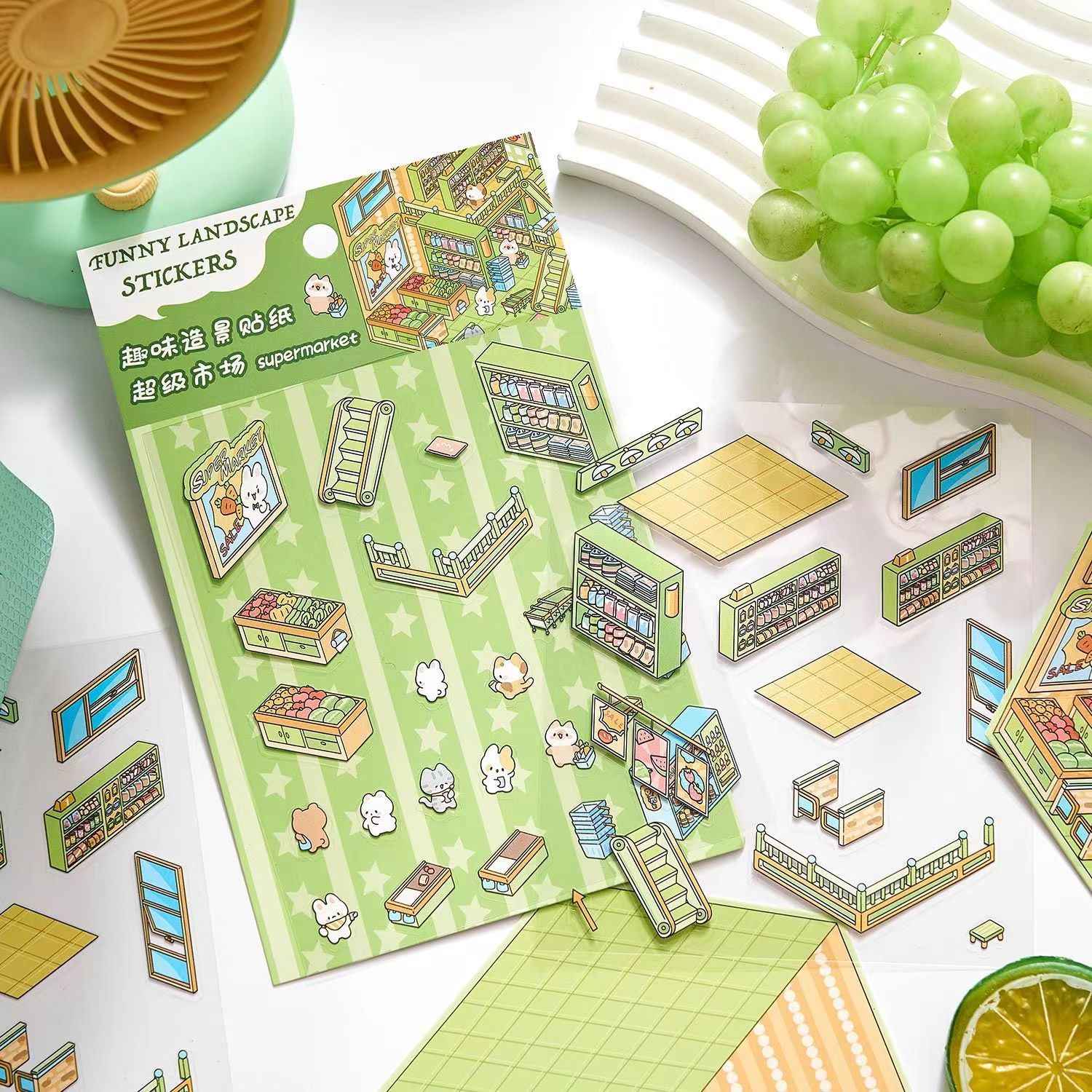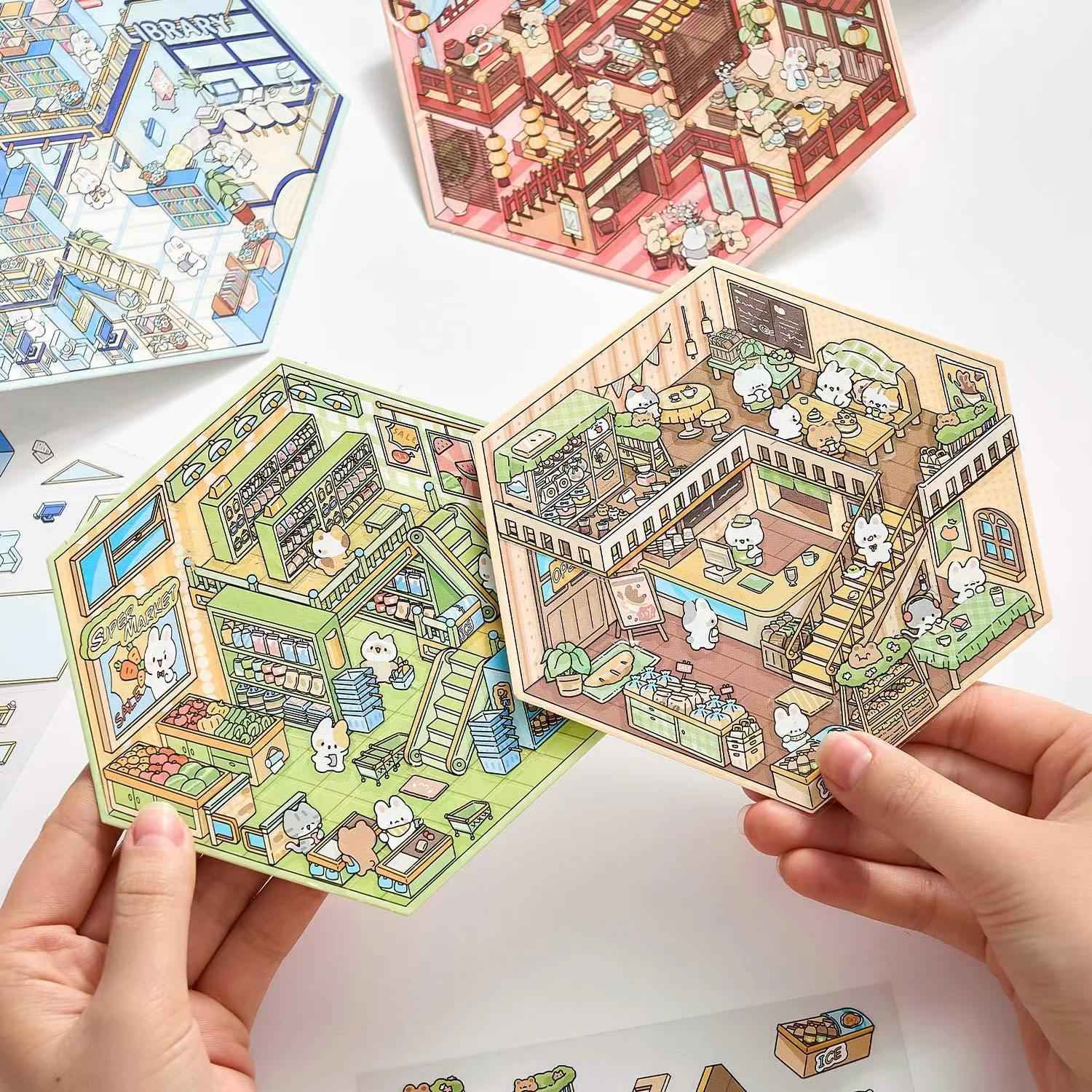 Enter the world of Cute Bunny Shop with these adorable 3D Sticker Scenes. Featuring 4 delightful themes: Library, Coffee Shop, Supermarket, and Restaurant, these stickers let you create a whimsical and cozy environment filled with cute bunnies in their favorite hangout spots.