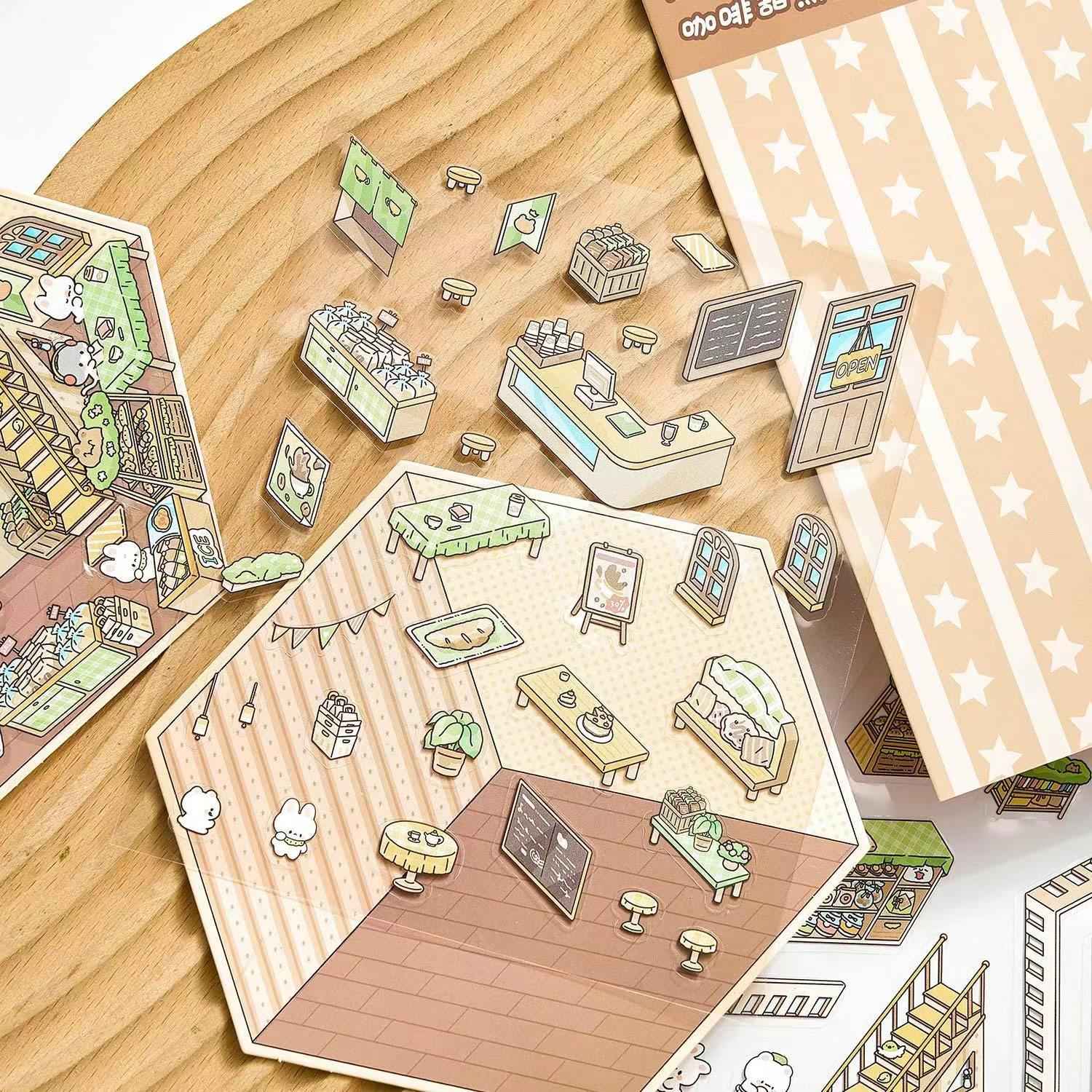 Cute Bunny Shop – 3D Sticker Scenes - 4 Theme Sets: Library | Coffee Shop | Supermarket | Restaurant