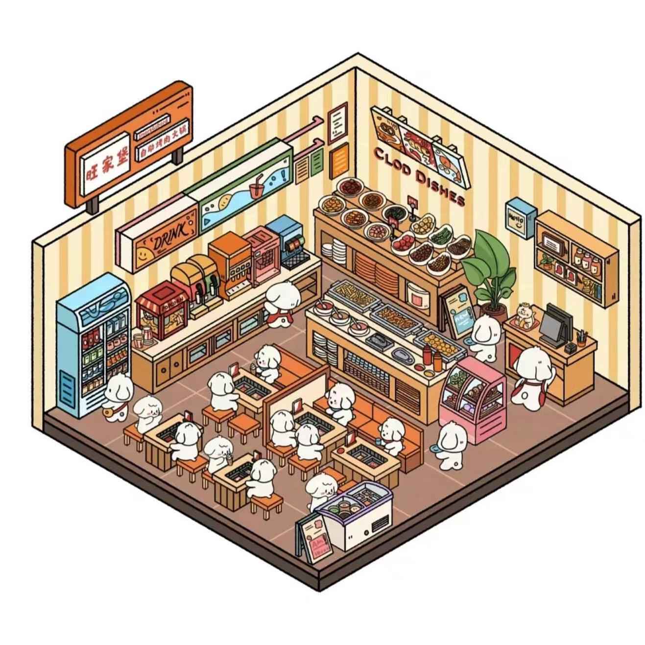 Cute Puppy 3D Isometric Room Stickers – 8 Theme Sets: Christmas Party | Clothing Store | Flower Shop | BBQ Restaurant | Wedding | Happy New Year | Dress Shop | Temple Fair