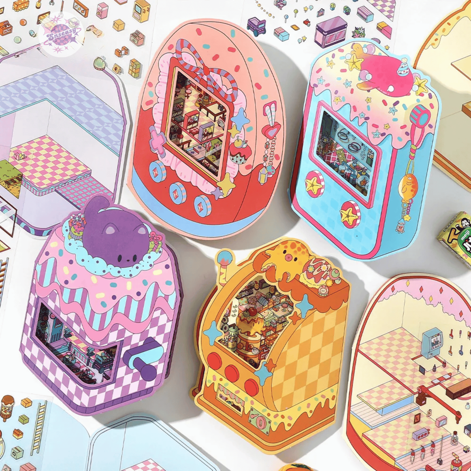 Fantasy Arcade – Flip-Open Design 3D Sticker Set – 4 Theme Scenes: Undersea Lab | Candy Game Center | Starry Music Hall | Crystal Gem Collector's Room