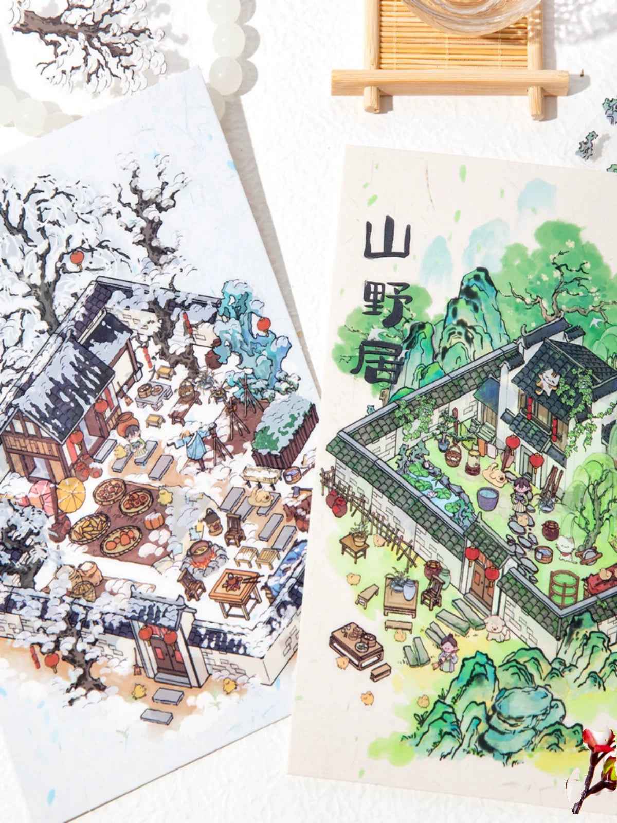 Traditional Chinese Ink Painting Style – 4 Seasons Cottage 3D Stickers Scene - 4 Theme Sets: Spring Peach Blossoms | Summer Mountain | Autumn Forest | Winter Snow